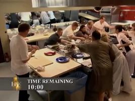 On Episode 3, the second challenge happened when there were 13 chefs left, 7 on the blue team, and 6 on the red team. Known as the Chicken Cutting Challenge, Ramsay gave both teams 5 minutes to finely cut a whole chicken into eight pieces. Because the blue team had an extra person, Louross was forced to sit out. Due to Craig’s horrible botching of his chicken, the red team won the challenge 44-24. They went to Saddle Ranch Chop House for lunch, while the blue team had to pick peppers on a 100-acre farm.[5]