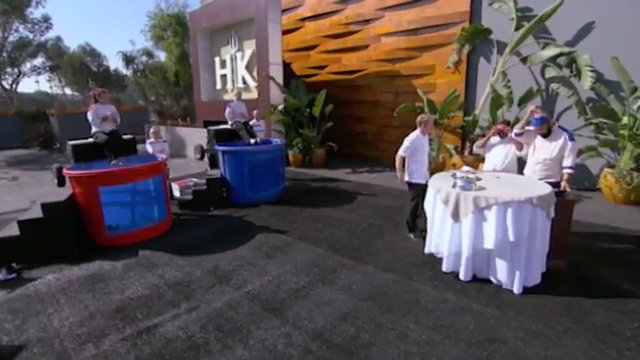 The next day, Sous Chef James called the dorms and told Alison to bring everybody out to the front entrance. Once outside, T noticed something underneath black capes and began wondering what would happen. Then, Ramsay asked the chefs if they were confident in their palates. When everybody said they were, Ramsay announced the annual Blind Taste Test and revealed that he brought back the dunk tanks from the previous season. However, nobody was excited about that news, and Milly said that he did not want in any part of the dunk tank as he did not want to get his clothes wet. As with the previous season, one chef would taste four ingredients while their teammates were in the dunk tank. If the chef got three or four incorrect answers, their teammate would be sent to the dunk tank.