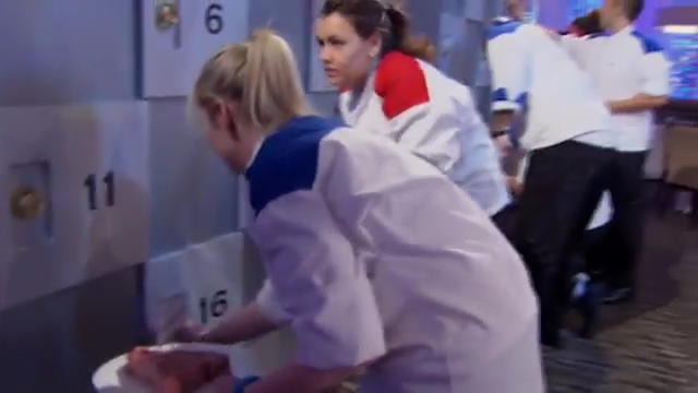 Josh sent up his garnishes two hours into service, and Alison sent up her refire not long after. However, Ramsay saw that the salmon was overcooked on one side. Michelle was shocked as Alison still did not know how to cook salmon, despite it being their eleventh dinner service. After, Ramsay called Steak Night disaster night, reminded the red team that they had nine tables left to fire, and accused them of not caring. Despite suggesting that the red team should go home, Ramsay relocated T to the fish station, and a very embarrassed Alison stated that she wanted to die right now. T announced that she needed four minutes on her salmon, asked Josh to get garnish ready, and knew that she wanted to get rolling and not have fish be the zero instead of a hero despite being in a sinking position. T was finally able to get the salmon refire accepted, and Marino finally served it to the incomplete table. However, Ramsay asked the new black jacket chefs to go and help the red team complete service and told the red team that the blue team earned them. Michelle was infuriated that the blue team already had black jackets while she was still in red, Milly and Josh had an argument over garnish, and Nick knew that the red team were not happy to see them in black. With the help of the black jacket chefs, the red kitchen was finally able to complete service.