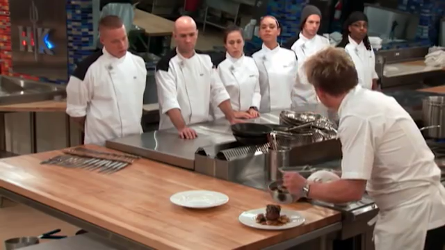 The new black jacket chefs came down in the kitchen, and met Ramsay who was cooking a dish. As Ramsay was plating his dish, he noticed that there was no more red or blue teams, and gave them the dish to taste. The dish everyone tasted was one of Ramsay’s signature dishes, and after Ramsay explained how he would always try and imagine what the dishes ingredients were, he announced that the next challenge would be the Taste It Now Make It Challenge. Then, the six chefs were broken up into three teams of two, consisting of Van and Ariel, with the latter being concerned as Van has been nominated twice before, Tennille and Kevin, much to Tennille’s happiness, and Dave and Suzanne, which Dave decided to reluctantly go with. After, Sous Chef Scott brought a dish that was cooked in one of his own Los Angeles restaurants for the chefs to taste.