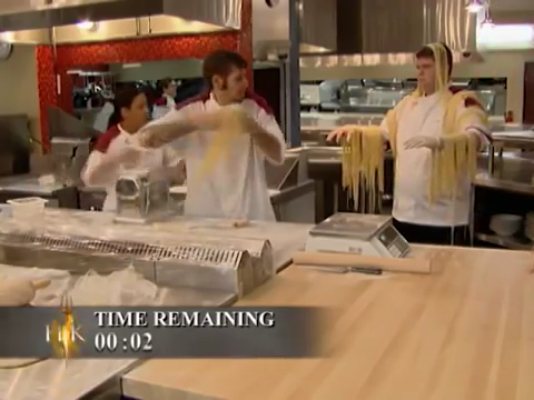 For that challenge, Ramsay has both teams make pasta from a pasta machine with a certain time limit. Once both teams completed making their pasta strands, they must have one person from their team hold the pasta on their arms/body. Once time was up, Ramsay will look at the pasta from each team and accept them if they match his standards before placing them on a scale. The team with the most weight wins.