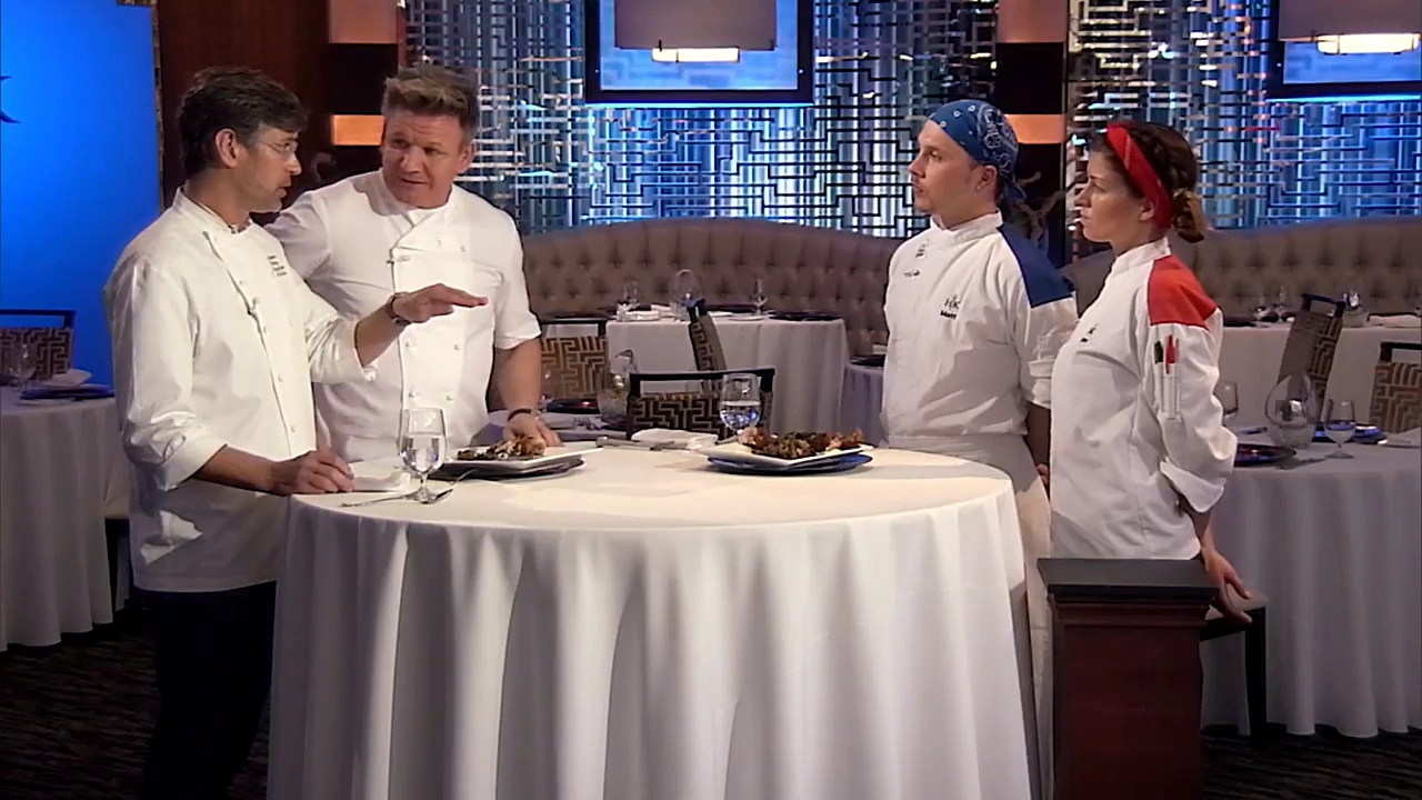 | Episode Rundown: The final three's tableside skills were tested, they took turns running the pass, and Ramsay picked two of them for the finals. | ||||